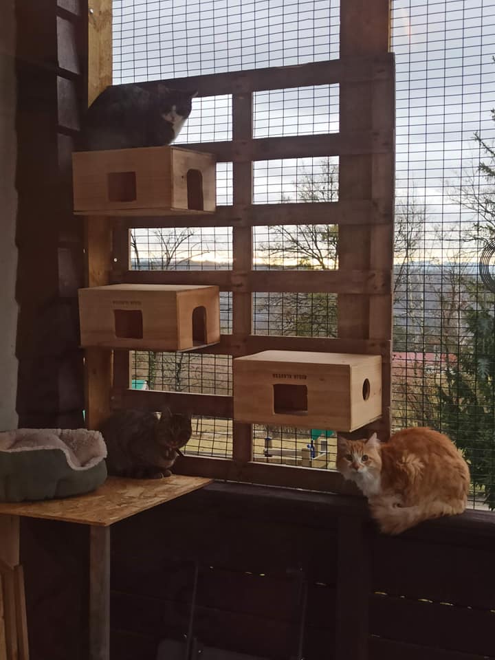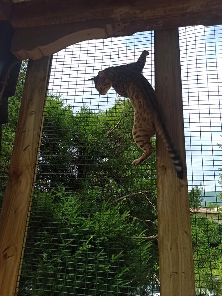 Les chats vivent tous ensemble et disposent d’une zone réservée avec un accès extérieur totalement sécurisé. Tout est adapté pour le confort, la tranquillité et l’épanouissement de vos chats : Plusieurs espaces de jeux et de repos, au sol ou en hauteur.